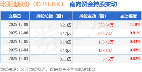 证券之星消息,12月9日南向资金增持373.34万股比亚迪股份(01211.HK)。近5个交易日中,获南向资金增持的有5天,累计净增持919.55万股。近20个交易日中,获南向资金增持的有19天,累计净增持1790.49万股。截至目前,南向资金持有比亚迪股份(01211.HK)3.21亿股,占公司已发行普通股的8.69%。