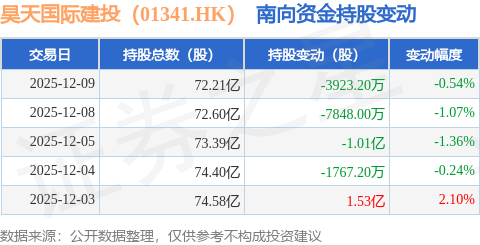 证券之星消息,12月9日南向资金减持3923.2万股昊天国际建投(01341.HK)。近5个交易日中,获南向资金减持的有4天,累计净减持8322.4万股。近20个交易日中,获南向资金增持的有9天,累计净增持2.31亿股。截至目前,南向资金持有昊天国际建投(01341.HK)72.21亿股,占公司已发行普通股的66.57%。