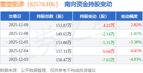 证券之星消息,12月9日南向资金增持4.22万股重塑能源(02570.HK)。近5个交易日中,获南向资金减持的有3天,累计净减持4.23万股。近20个交易日中,获南向资金增持的有7天,累计净增持79.75万股。截至目前,南向资金持有重塑能源(02570.HK)153.87万股,占公司已发行普通股的2.66%。