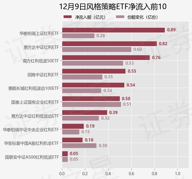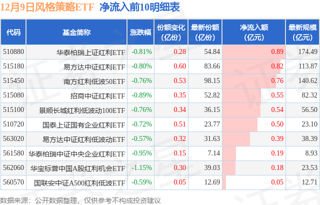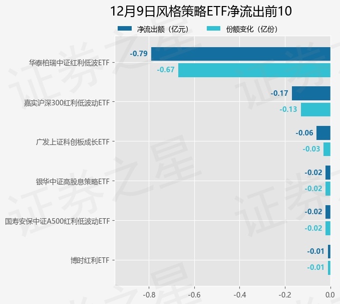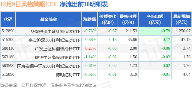 当日有6只风格策略ETF基金出现资金净流出,其中净流出排首位的是华泰柏瑞中证红利低波ETF(512890),份额减少了6700.0万份,净流出额为7930.17万元。