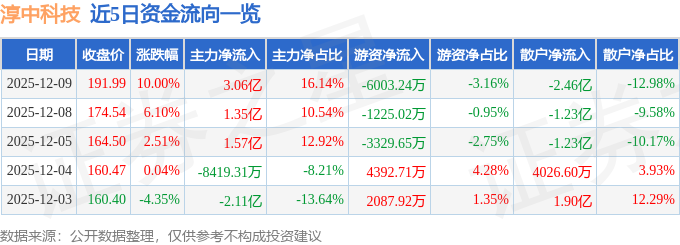 证券之星消息,截至2025年12月9日收盘,淳中科技(603516)报收于191.99元,上涨10.0%,涨停,换手率5.13%,成交量10.42万手,成交额18.98亿元。