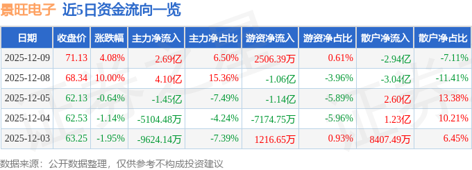 证券之星消息,截至2025年12月9日收盘,景旺电子(603228)报收于71.13元,上涨4.08%,换手率6.0%,成交量58.53万手,成交额41.35亿元。