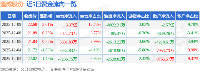 12月9日的资金流向数据方面,主力资金净流入3.37亿元,占总成交额12.73%,游资资金净流出8022.31万元,占总成交额3.03%,散户资金净流出2.57亿元,占总成交额9.7%。