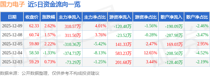 证券之星消息,截至2025年12月9日收盘,国力电子(688103)报收于62.33元,上涨2.62%,换手率1.31%,成交量1.25万手,成交额7739.47万元。