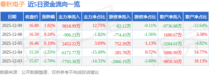 证券之星消息,截至2025年12月9日收盘,春秋电子(603890)报收于16.8元,上涨1.82%,换手率10.06%,成交量45.85万手,成交额7.7亿元。