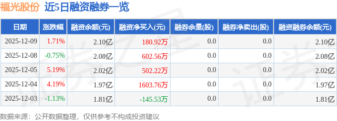 福光股份融资融券信息显示,融资方面,当日融资买入3613.3万元,融资偿还3432.39万元,融资净买入180.92万元,连续3日净买入累计1285.69万元。融券方面,融券卖出0.0股,融券偿还0.0股,融券余量0.0股,融券余额0.0万元。融资融券余额2.1亿元。
