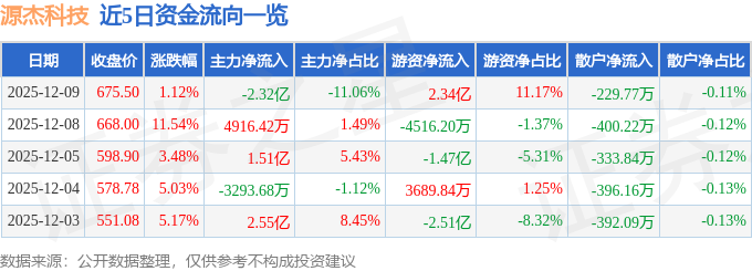 证券之星消息,截至2025年12月9日收盘,源杰科技(688498)报收于675.5元,上涨1.12%,换手率5.17%,成交量3.11万手,成交额20.95亿元。