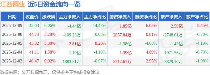 证券之星消息,截至2025年12月9日收盘,江西铜业(600362)报收于42.03元,下跌6.06%,换手率3.46%,成交量71.81万手,成交额30.69亿元。
