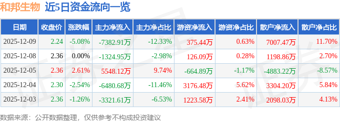 证券之星消息,截至2025年12月9日收盘,和邦生物(603077)报收于2.24元,下跌5.08%,换手率2.99%,成交量263.91万手,成交额5.99亿元。