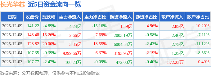 证券之星消息,截至2025年12月9日收盘,长光华芯(688048)报收于141.22元,下跌4.89%,换手率11.11%,成交量19.58万手,成交额27.94亿元。