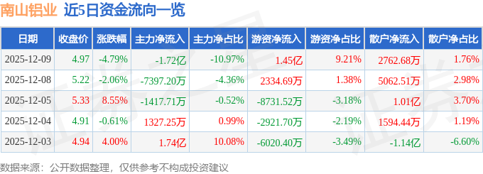 证券之星消息,截至2025年12月9日收盘,南山铝业(600219)报收于4.97元,下跌4.79%,换手率2.7%,成交量313.36万手,成交额15.7亿元。