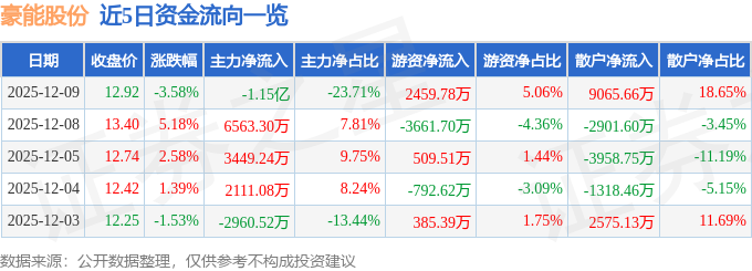 证券之星消息,截至2025年12月9日收盘,豪能股份(603809)报收于12.92元,下跌3.58%,换手率4.05%,成交量37.27万手,成交额4.86亿元。