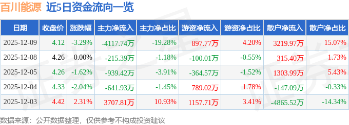证券之星消息,截至2025年12月9日收盘,百川能源(600681)报收于4.12元,下跌3.29%,换手率3.83%,成交量51.26万手,成交额2.14亿元。