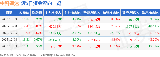 证券之星消息,截至2025年12月9日收盘,中科通达(688038)报收于16.84元,下跌3.27%,换手率1.55%,成交量1.8万手,成交额3080.71万元。