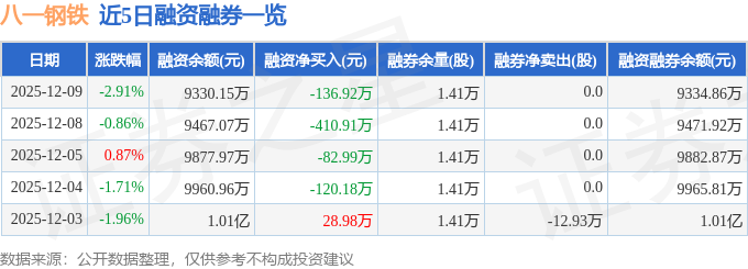 八一钢铁融资融券信息显示,融资方面,当日融资买入181.86万元,融资偿还318.77万元,融资净偿还136.92万元。融券方面,融券卖出0.0股,融券偿还0.0股,融券余量1.41万股,融券余额4.71万元。融资融券余额9334.86万元。
