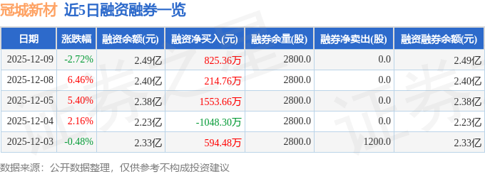 冠城新材融资融券信息显示,融资方面,当日融资买入3856.28万元,融资偿还3030.92万元,融资净买入825.36万元,连续3日净买入累计2593.77万元。融券方面,融券卖出0.0股,融券偿还0.0股,融券余量2800.0股,融券余额1.3万元。融资融券余额2.49亿元。