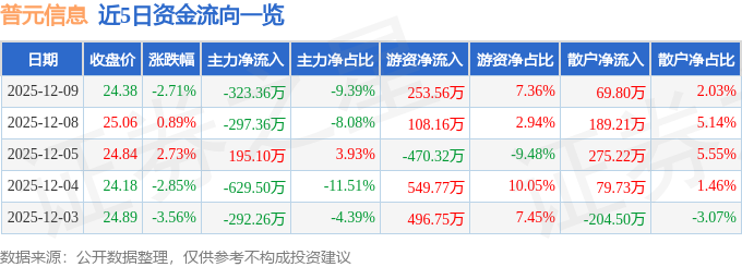 证券之星消息,截至2025年12月9日收盘,普元信息(688118)报收于24.38元,下跌2.71%,换手率1.5%,成交量1.4万手,成交额3445.22万元。
