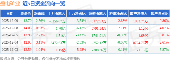 证券之星消息,截至2025年12月9日收盘,盛屯矿业(600711)报收于13.7元,下跌2.56%,换手率5.44%,成交量168.1万手,成交额23.06亿元。