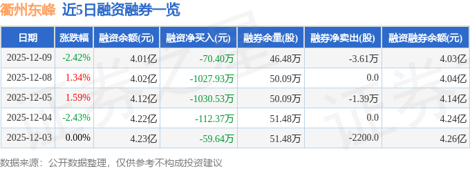 衢州东峰融资融券信息显示,融资方面,当日融资买入1050.26万元,融资偿还1120.67万元,融资净偿还70.4万元。融券方面,融券卖出0.0股,融券偿还3.61万股,融券余量46.48万股,融券余额205.91万元。融资融券余额4.03亿元。