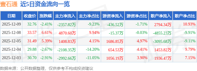证券之星消息,截至2025年12月9日收盘,壹石通(688733)报收于32.76元,下跌2.41%,换手率3.88%,成交量7.76万手,成交额2.56亿元。