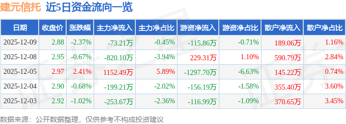 证券之星消息,截至2025年12月9日收盘,建元信托(600816)报收于2.88元,下跌2.37%,换手率1.02%,成交量55.97万手,成交额1.62亿元。
