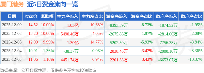 证券之星消息,截至2025年12月9日收盘,厦门港务(000905)报收于14.52元,上涨10.0%,已连续涨停3天,换手率9.0%,成交量66.76万手,成交额9.62亿元。