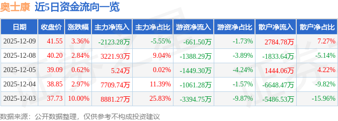 证券之星消息,截至2025年12月9日收盘,奥士康(002913)报收于41.55元,上涨3.36%,换手率3.05%,成交量9.19万手,成交额3.83亿元。