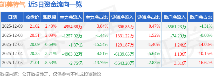 证券之星消息,截至2025年12月9日收盘,凯美特气(002549)报收于21.02元,上涨2.49%,换手率8.95%,成交量61.98万手,成交额12.89亿元。