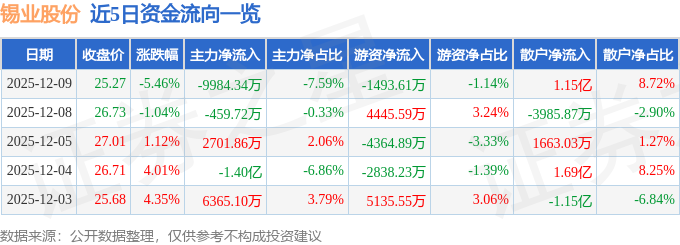 证券之星消息,截至2025年12月9日收盘,锡业股份(000960)报收于25.27元,下跌5.46%,换手率3.13%,成交量51.45万手,成交额13.16亿元。