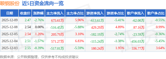 证券之星消息,截至2025年12月9日收盘,鞍钢股份(000898)报收于2.47元,下跌2.76%,换手率0.57%,成交量45.41万手,成交额1.13亿元。