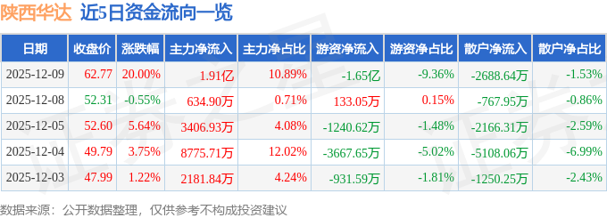 证券之星消息,截至2025年12月9日收盘,陕西华达(301517)报收于62.77元,上涨20.0%,涨停,换手率29.57%,成交量29.02万手,成交额17.58亿元。