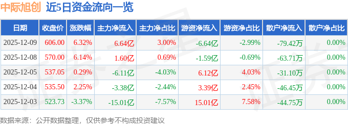 证券之星消息,截至2025年12月9日收盘,中际旭创(300308)报收于606.0元,上涨6.32%,换手率3.36%,成交量37.13万手,成交额221.79亿元。