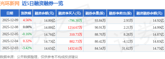 光环新网融资融券信息显示,融资方面,当日融资买入1.95亿元,融资偿还2.03亿元,融资净偿还796.3万元。融券方面,融券卖出3.48万股,融券偿还5500.0股,融券余量93.84万股,融券余额1247.12万元。融资融券余额14.92亿元。