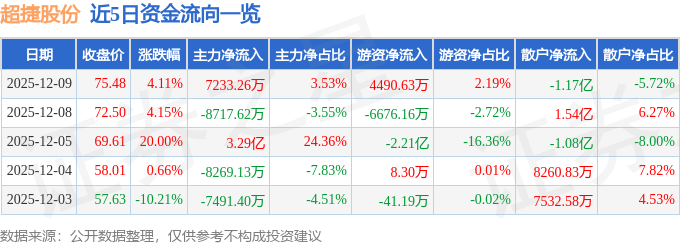 证券之星消息,截至2025年12月9日收盘,超捷股份(301005)报收于75.48元,上涨4.11%,换手率20.49%,成交量27.12万手,成交额20.51亿元。