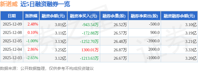 新诺威融资融券信息显示,融资方面,当日融资买入2367.37万元,融资偿还3310.91万元,融资净偿还943.54万元。融券方面,融券卖出3800.0股,融券偿还4300.0股,融券余量26.52万股,融券余额834.29万元。融资融券余额3.1亿元。
