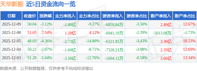 证券之星消息,截至2025年12月9日收盘,天华新能(300390)报收于50.04元,下跌3.12%,换手率5.8%,成交量39.04万手,成交额19.62亿元。