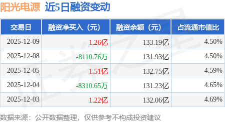 证券之星消息,12月9日,阳光电源(300274)融资买入22.88亿元,融资偿还21.62亿元,融资净买入1.26亿元,融资余额133.19亿元,当日融资净买入排名第31。