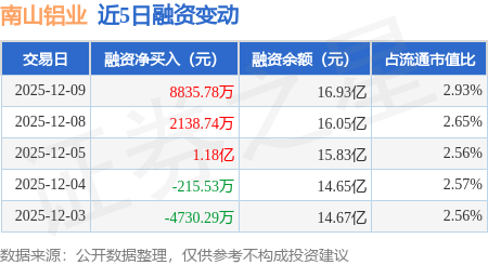 证券之星消息,12月9日,南山铝业(600219)融资买入2.7亿元,融资偿还1.82亿元,融资净买入8835.78万元,融资余额16.93亿元,近3个交易日已连续净买入累计2.28亿元。
