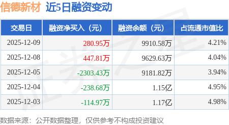证券之星消息,12月9日,信德新材(301349)融资买入1106.39万元,融资偿还825.45万元,融资净买入280.95万元,融资余额9910.58万元。