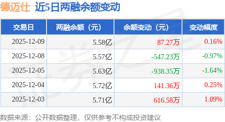 证券之星消息,12月9日,德迈仕(301007)融资买入1614.93万元,融资偿还1527.66万元,融资净买入87.27万元,融资余额5.58亿元。