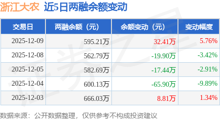 证券之星消息,12月9日,浙江大农(920855)融资买入34.96万元,融资偿还2.55万元,融资净买入32.41万元,融资余额595.21万元,近20个交易日中有11个交易日出现融资净买入。