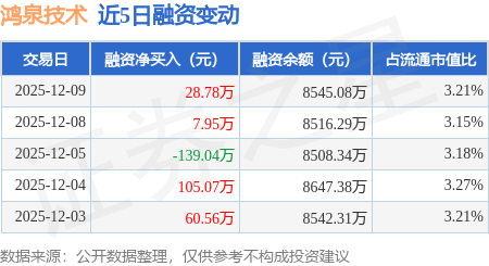 证券之星消息,12月9日,鸿泉技术(688288)融资买入223.91万元,融资偿还195.13万元,融资净买入28.78万元,融资余额8545.08万元。