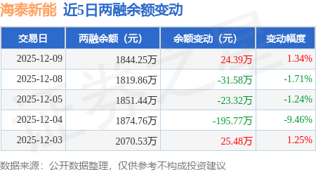 证券之星消息,12月9日,海泰新能(920985)融资买入40.75万元,融资偿还16.36万元,融资净买入24.39万元,融资余额1844.25万元,近20个交易日中有11个交易日出现融资净买入。