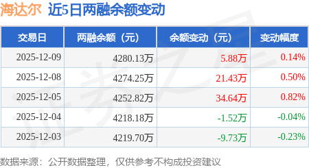 证券之星消息,12月9日,海达尔(920699)融资买入178.15万元,融资偿还172.27万元,融资净买入5.88万元,融资余额4280.13万元,近3个交易日已连续净买入累计61.95万元,近20个交易日中有12个交易日出现融资净买入。