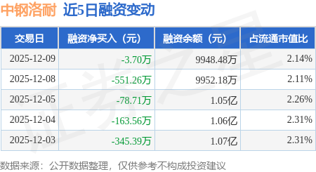 证券之星消息,12月9日,中钢洛耐(688119)融资买入627.52万元,融资偿还631.22万元,融资净卖出3.7万元,融资余额9948.48万元。