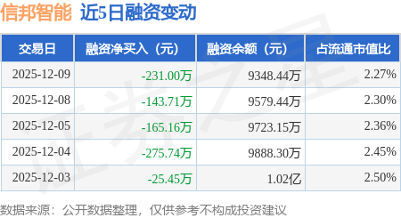 证券之星消息,12月9日,信邦智能(301112)融资买入194.84万元,融资偿还425.84万元,融资净卖出231.0万元,融资余额9348.44万元。