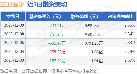 证券之星消息,12月9日,兰卫医学(301060)融资买入402.61万元,融资偿还636.52万元,融资净卖出233.91万元,融资余额9299.38万元。
