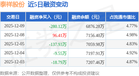 证券之星消息,12月9日,泰祥股份(301192)融资买入257.34万元,融资偿还537.46万元,融资净卖出280.12万元,融资余额6876.28万元。