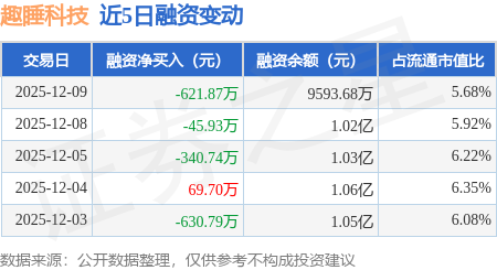 证券之星消息,12月9日,趣睡科技(301336)融资买入988.76万元,融资偿还1610.63万元,融资净卖出621.87万元,融资余额9593.68万元。