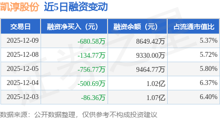 证券之星消息,12月9日,凯淳股份(301001)融资买入1110.74万元,融资偿还1791.32万元,融资净卖出680.58万元,融资余额8649.42万元。
